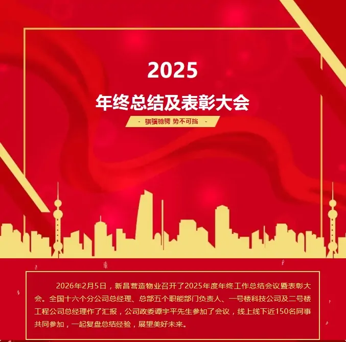 2026年2月5日,新昌营造物业召开了2025年度年终工作总结会议暨表彰大会。全国十六个分公司总经理、总部五个职能部门负责人、一号楼科技公司及二号楼工程公司总经理作了汇报,公司政委谭宇平先生参加了会议,线上线下近150名同事共同参加,一起复盘总结经验,展望美好未来。
